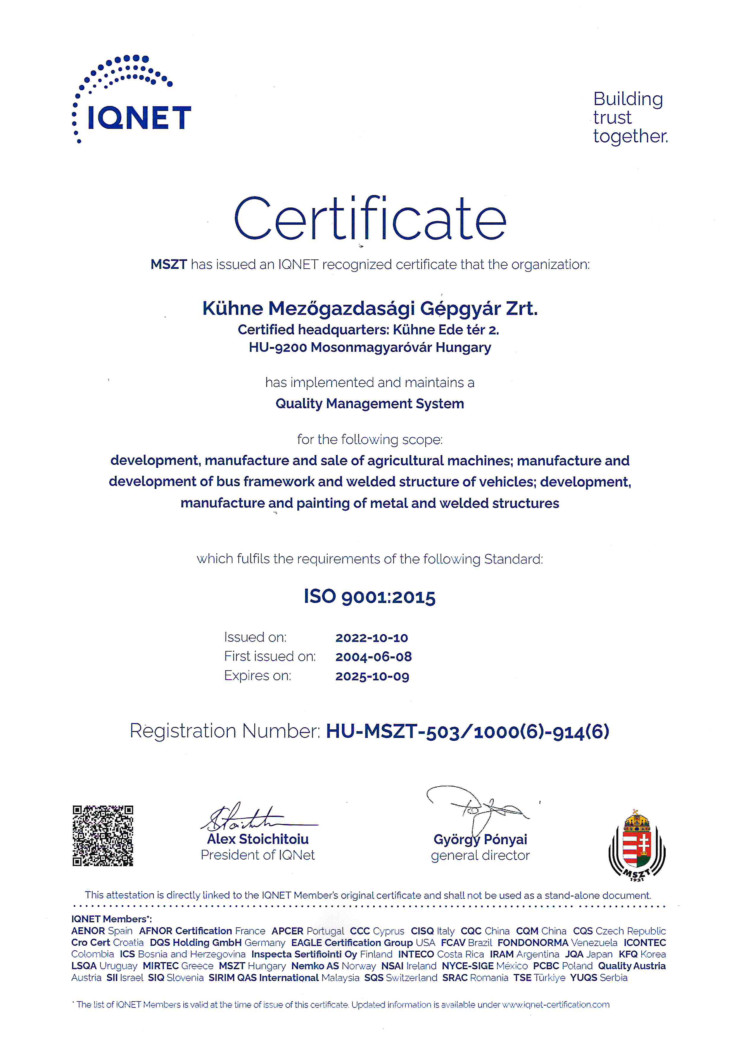 A Kühne Zrt. stratégiájának alapját képezik a minőségpolitikai célkitűzések. Ezek bevezetésével és megvalósításával fő célunk a termékekre alkalmazható jogszabályi-, szabványi-, vevői- és egyéb szabályzói előírások által támasztott-, illetve a társaságunk belső követelményeinek teljesítése, a minőségirányítási rendszer folyamatos fejlesztése, hogy a Vevők minőségi igényei kielégítést nyerjenek. A jelenleg érvényben lévő MSZ EN ISO 9001:2015 sz. szabvány szerint felépített minőségirányítási rendszert működtetünk.