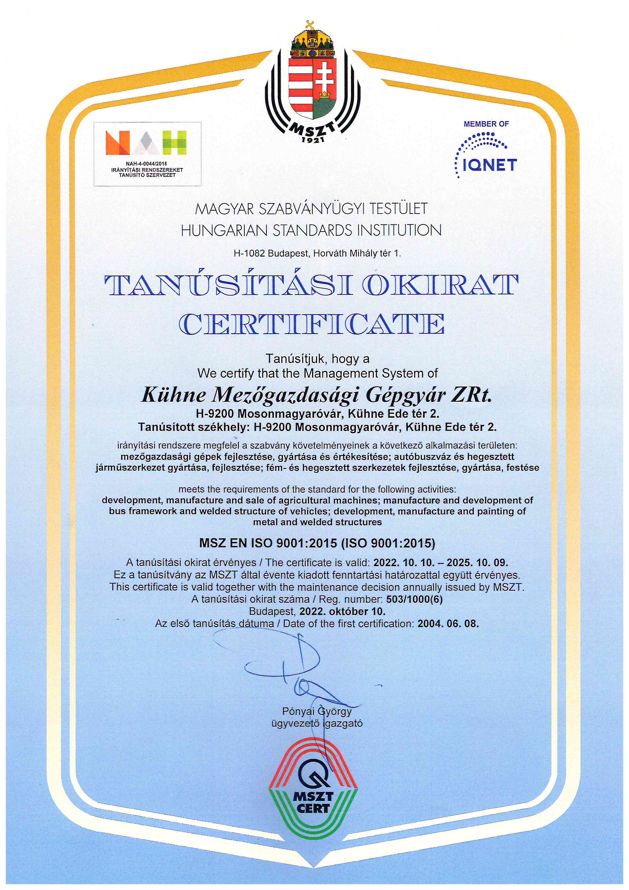 A Kühne Zrt. stratégiájának alapját képezik a minőségpolitikai célkitűzések. Ezek bevezetésével és megvalósításával fő célunk a termékekre alkalmazható jogszabályi-, szabványi-, vevői- és egyéb szabályzói előírások által támasztott-, illetve a társaságunk belső követelményeinek teljesítése, a minőségirányítási rendszer folyamatos fejlesztése, hogy a Vevők minőségi igényei kielégítést nyerjenek. A jelenleg érvényben lévő MSZ EN ISO 9001:2015 sz. szabvány szerint felépített minőségirányítási rendszert működtetünk.